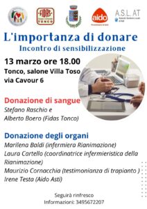 venerdì 13 marzo ore 18 – “L’importanza di donare: la donazione di sangue e la donazione degli organi” – in collaborazione con Fidas Tonco, Aido Asti e personale infermieristico della Rianimazione dell’Asl AT